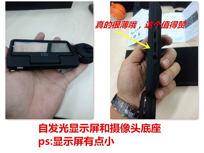 先来介绍自发光显示屏和摄像头底座吧。显示屏采用环保自发光有机材料制作,透明度达到80%,耐高温,防变形。整个底座真的很薄,说明产品的集成度很高。就是看起来显示屏有一点小。