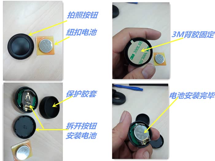 这是拍照按钮和纽扣电池。卸下按钮的保护胶套,扣开外壳,把电池安装好。这个按钮可以安装到任意位置,因为它是3M背胶固定的,可以安装到方便按下的位置,用于行车或者停车抓拍用。