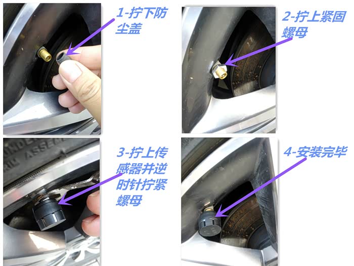 首先卸下原车的防尘帽,拧上固定螺母,装上传感器,用工具逆时针旋转固定螺母,锁紧传感器,安装完毕。外置胎压传感器很好安装,它防水防盗,所以可以放心使用。