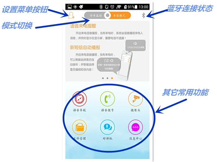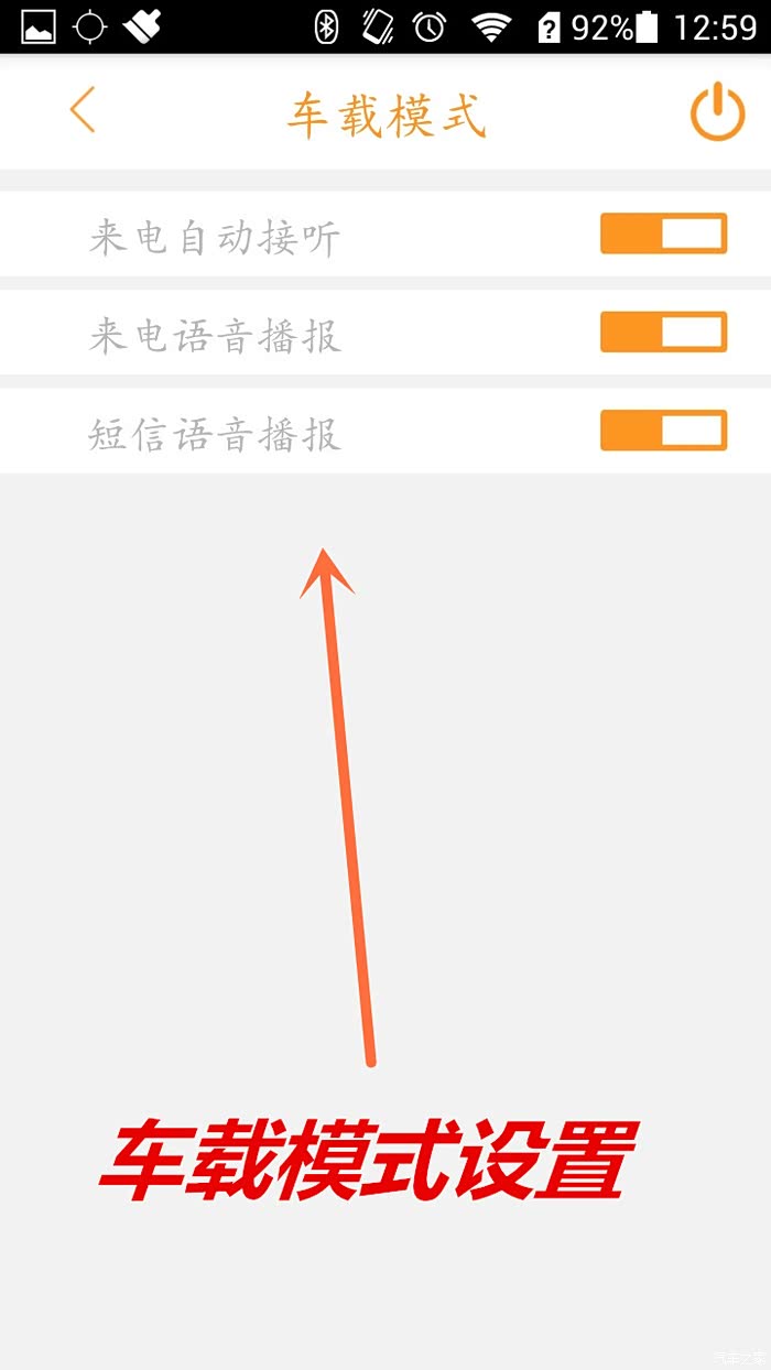 车载模式设置画面,可以设置来电接听,短信读报等功能