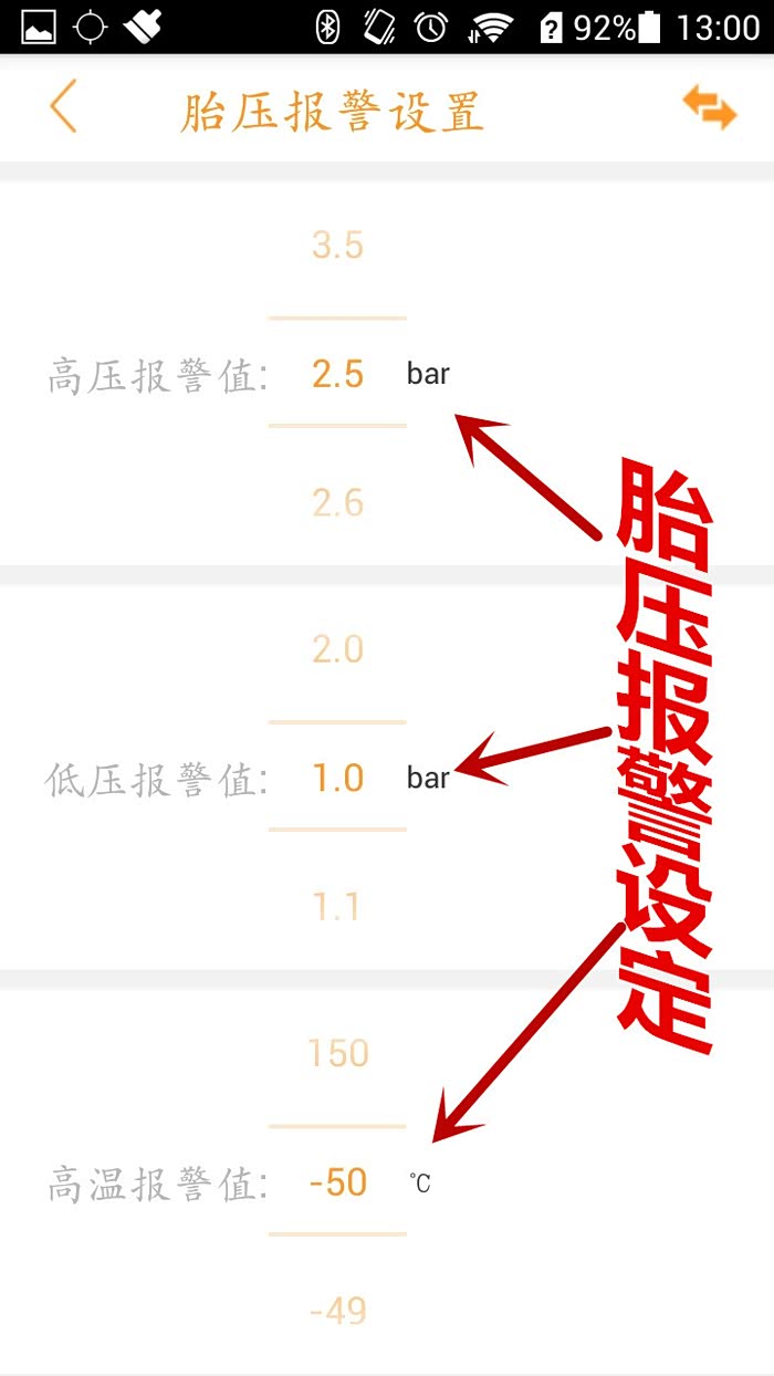 这是胎压报警设置,设置报警上限和下限,而且还有轮胎温度报警。