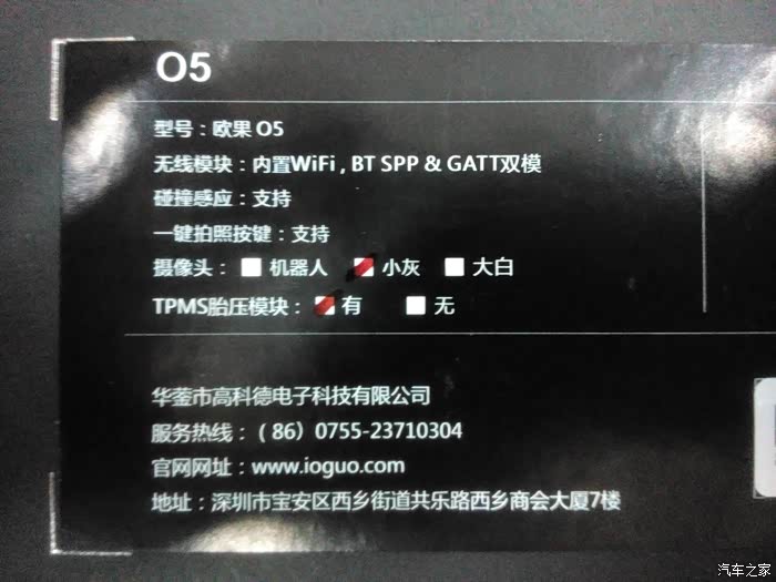 这是盒子背面标准的信息,型号是欧果O5,支持碰撞感应,摄像头为小灰,配有胎压监测模块等。