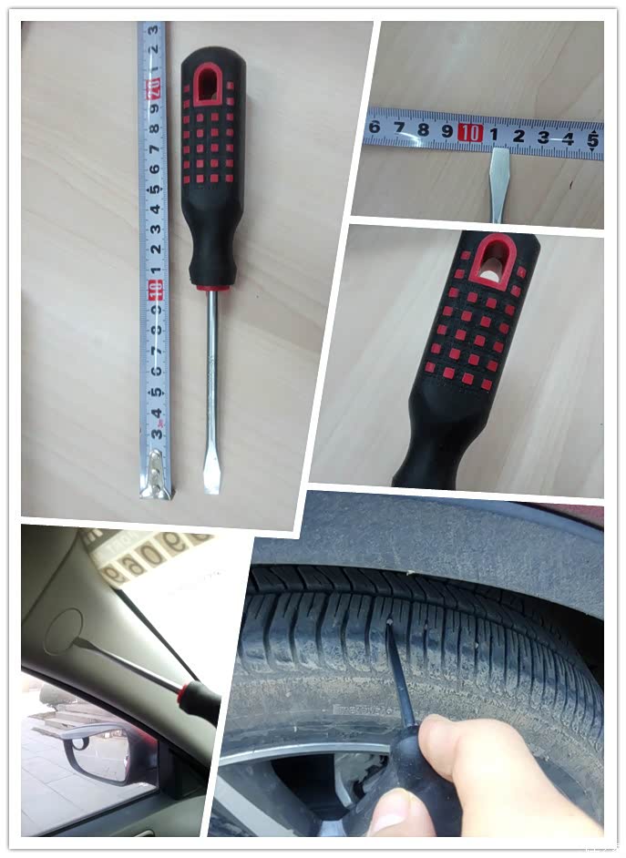 这是中号一字螺丝刀,橡胶把手,握着很舒服,也容易发力。长21cm,口宽6mm。可以用来撬盖板,紧固螺钉,当然,我还把它拿来剔除轮胎上了石子,的确是省力啊!再也不用钥匙扣了。。。