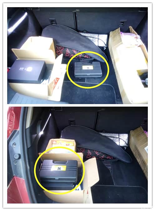 把工具盒放在后备箱里,果然是节省空间,我不圈起来,你是不是找不到它?咳咳咳。。。请忽略凌乱的后备箱,有滑板,羽毛球拍,清洗工具,哈哈