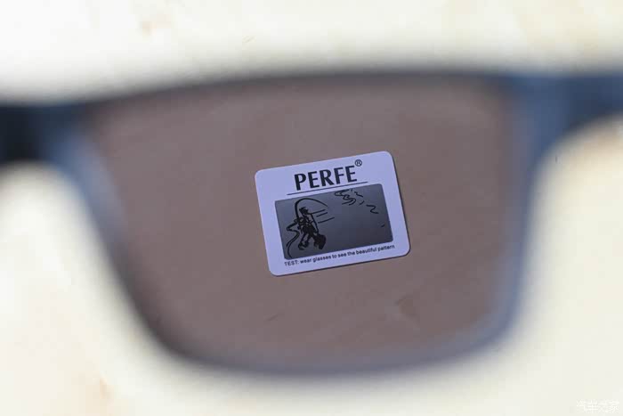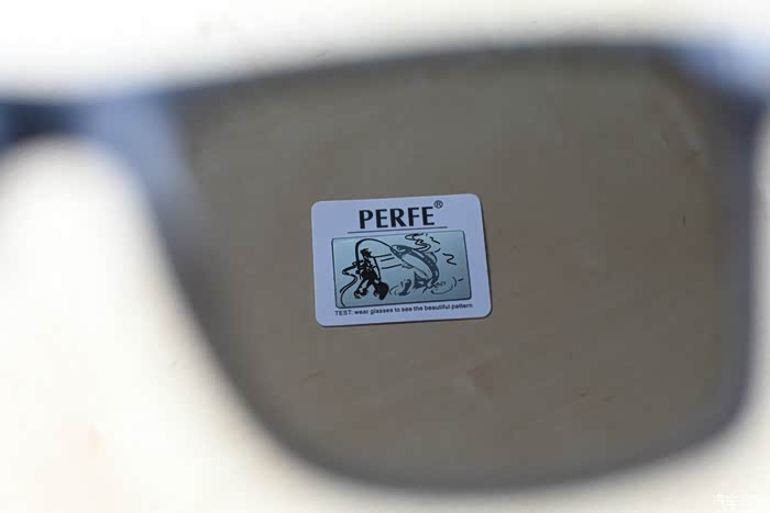 接下来,试下眼镜的偏光功能。在使用PERFE偏光太阳镜测试偏光测试卡时,可以清晰的看见图案上的那条鱼。