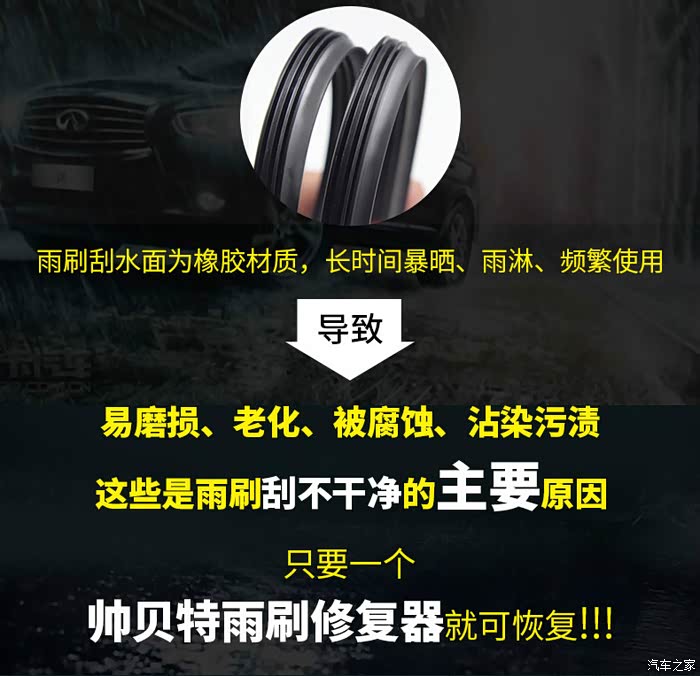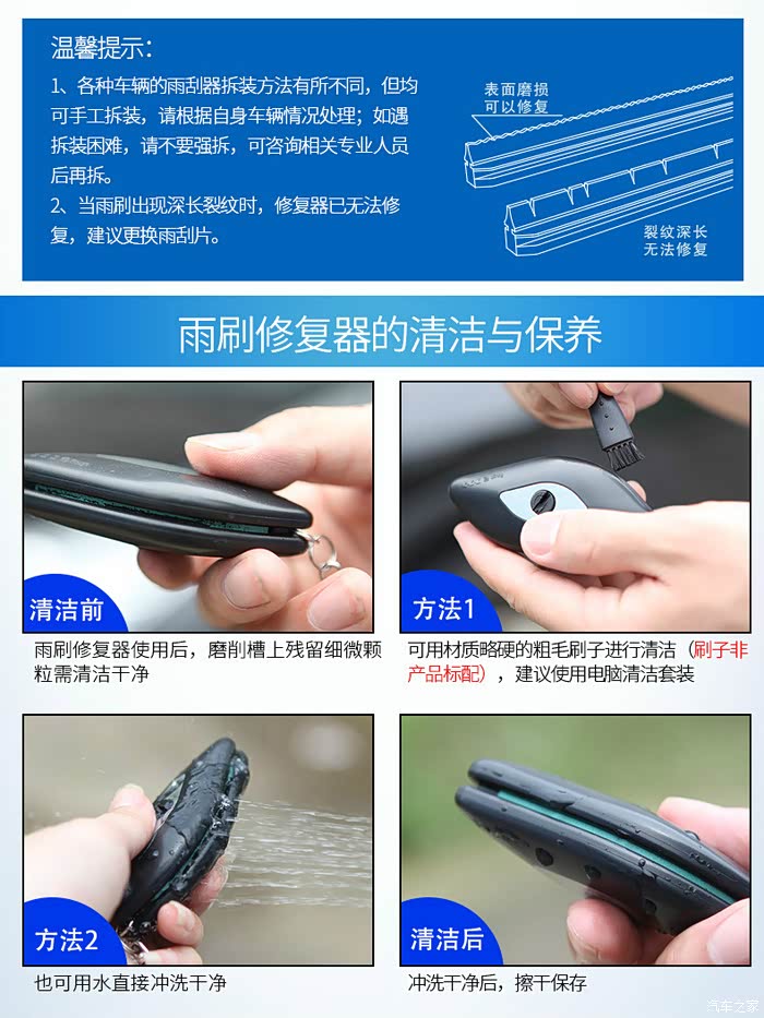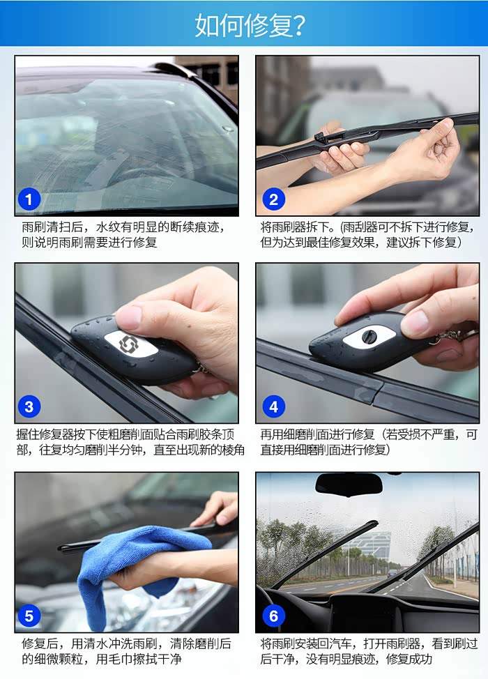 雨刮器是橡胶材质,长时间暴晒雨淋频繁的试用会导致磨损、老化、腐蚀等,以上原因是造成雨刮器刮不干净的主要原因,那我们是不是考虑换一对雨刮器?不!不用换,换了你就错了。这款产品我去某宝搜索,还真有发现这种产品的是实用性,有粗打磨和细打磨,并且有标记点看图清晰可见,下面来说下操作过程,握住修复器按下粗打磨铁盒雨刮器胶条顶部,均匀的打磨半分钟,直到出现新的棱角,然后再用细打磨进行修复,这里(如果你的雨刮器受损不严重的话可直接用细打磨来完成),切记一定是要均匀的打磨,不要受力不均!修复之后用清水清洗雨刮器,因为要消除打磨后的细微颗粒,之后用毛巾擦干净即可,再打开雨刮器你会惊人的发现竟然没有任何划痕如同新买的一样,焕然一新!今天你只要少吃一顿盖饭就可以省下上百元的费用!