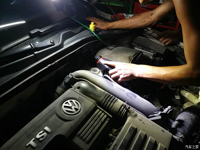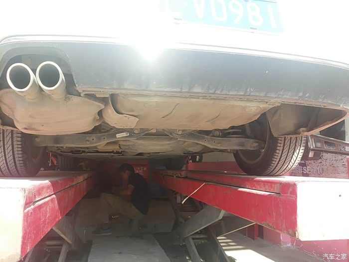 然后加入新油,小半瓶就加满了,你以为这样就结束了?并不是,还需要把车子升起来进行放油管里面的油!