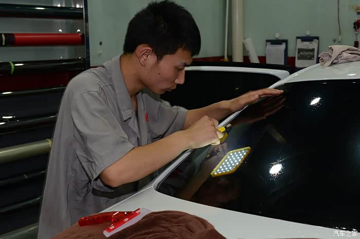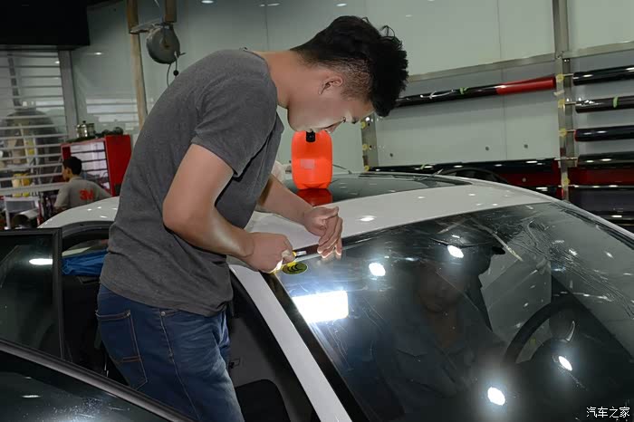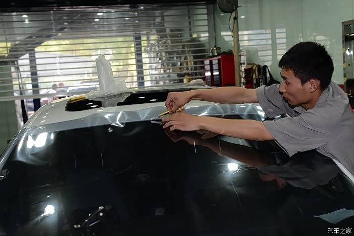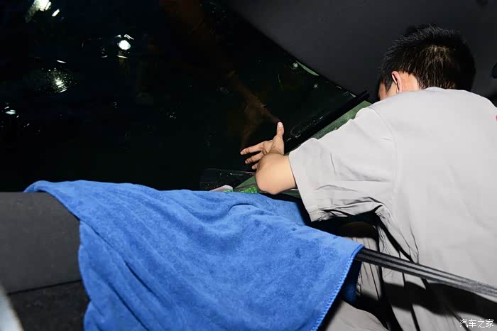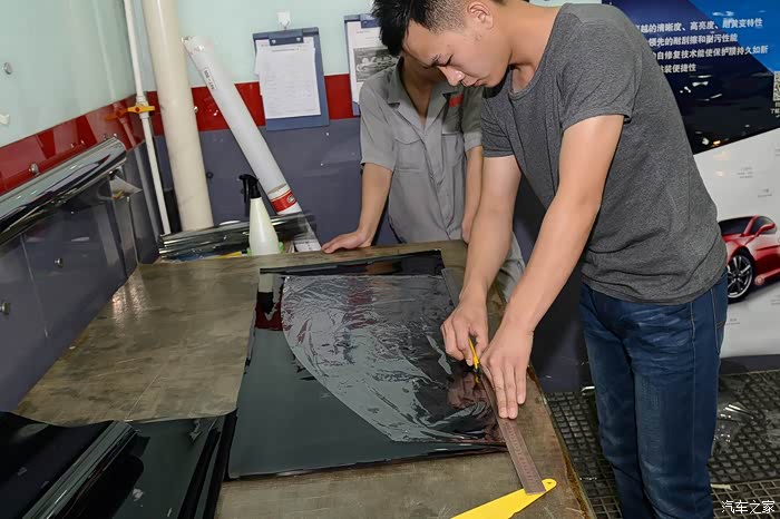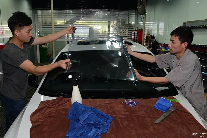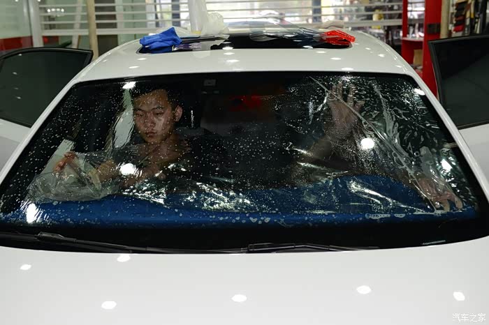裁剪完毕,把前风挡拿到车内,为了保证车膜的平整,所以这一道工序由两个人来完成
