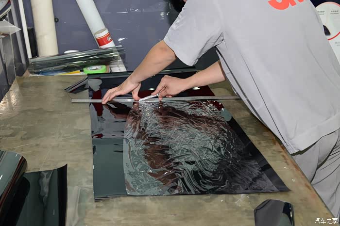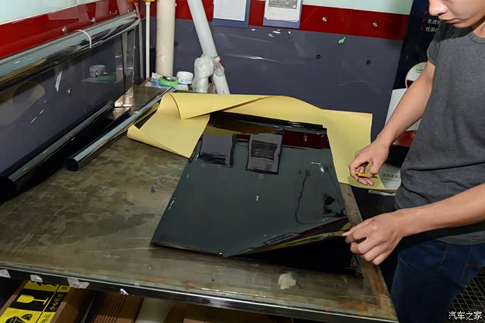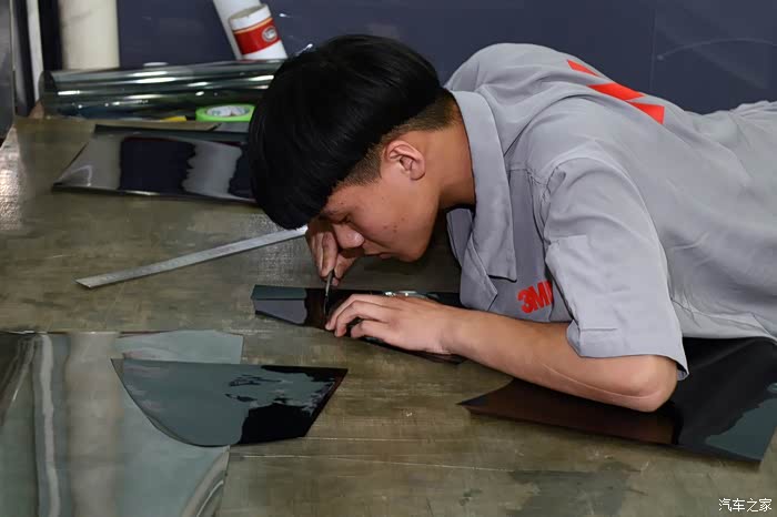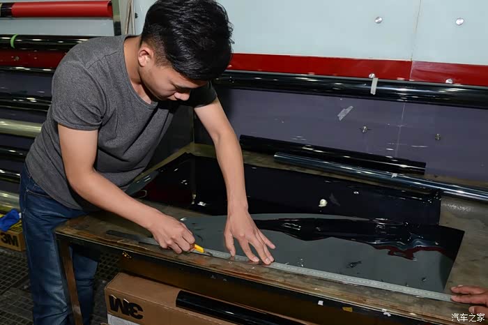 前风挡裁剪比较讲究功夫,因为得从两头分别裁,这条线要是歪了可就难看了