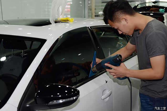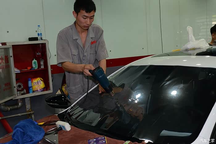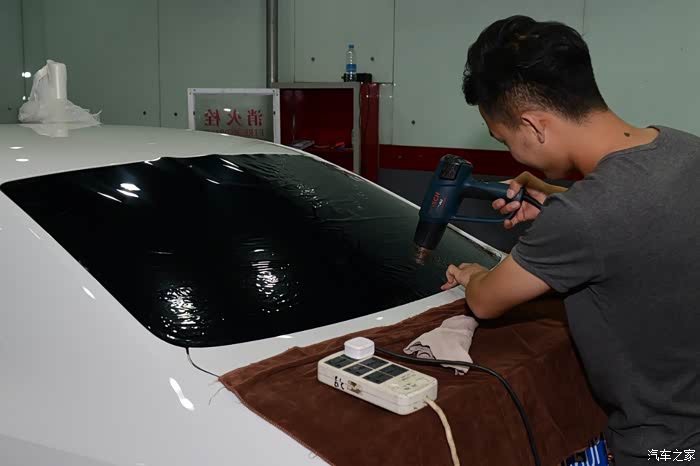 重要步骤:烘烤膜,消除在曲面上出现的皱折,使汽车贴膜严密贴附在玻璃上,与玻璃成同一弧度。