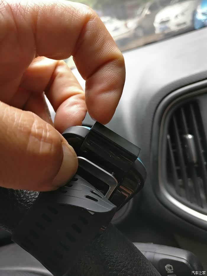 先把电池盒稍微拔出来一点点,然后把背带绕过方向盘,扣到翻扣的两个凸起上,再把翻扣压下去,压下电池盒就扣住了。这个安装方式还是很方便的。