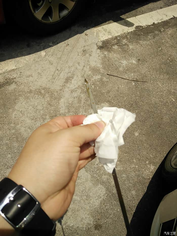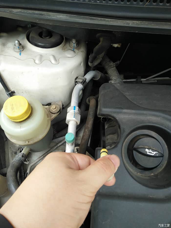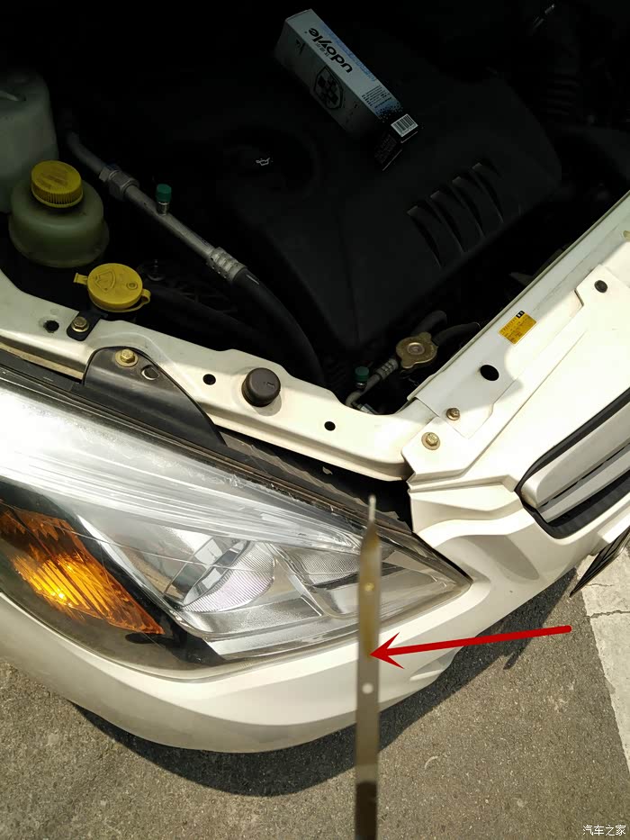 由于我刚刚于27000公里时做保养,更换了日本出光5W-30全合成机油,所以这次就不更换机油了,直接添加修复剂。先拔出机油尺,看看机油量是否正常。