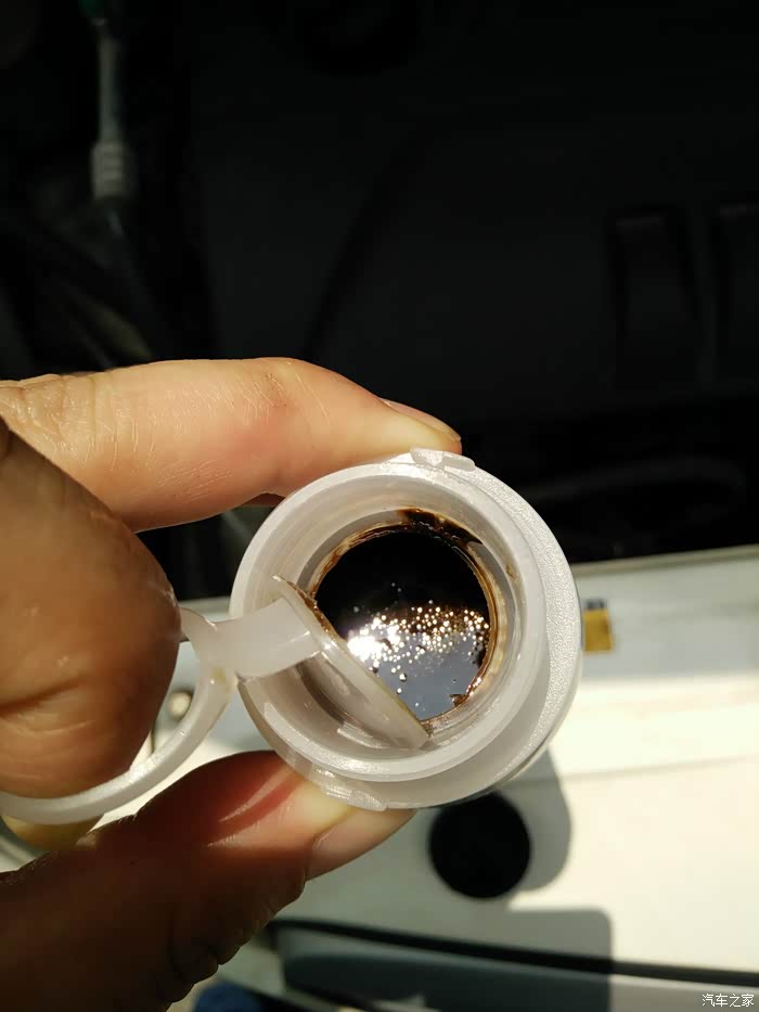 拉开修复剂的一次性内盖,可以看到这款修复剂呈油状,看起来与机油差不多,比机油略微粘稠,闻起来味道也与机油差不太多,在阳光的照射下,里面似乎有些颗粒闪闪发光。