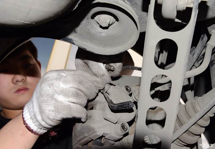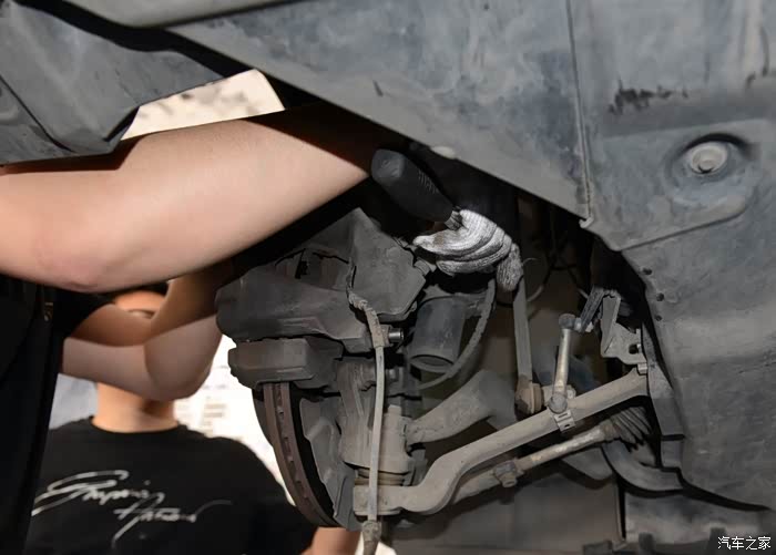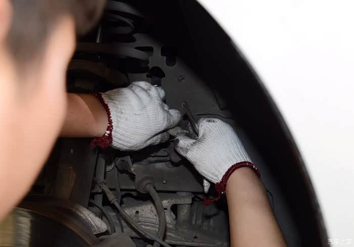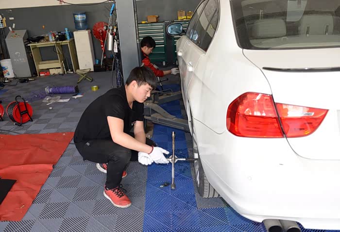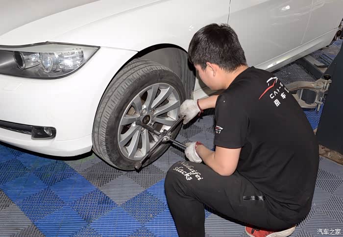 架子的位置确认之后,开始拆车轮,两位小哥同时忙活,效率倍增。