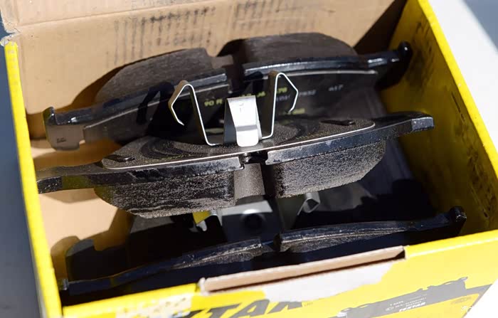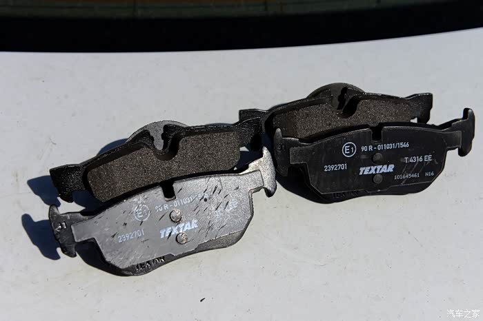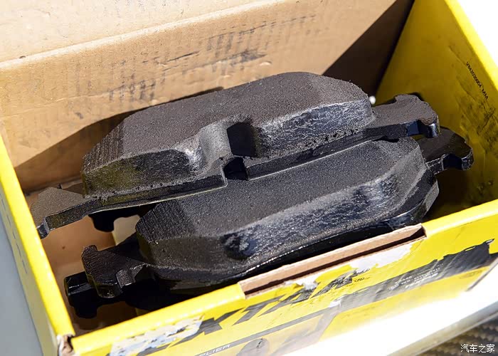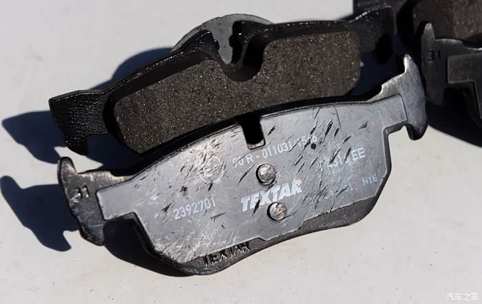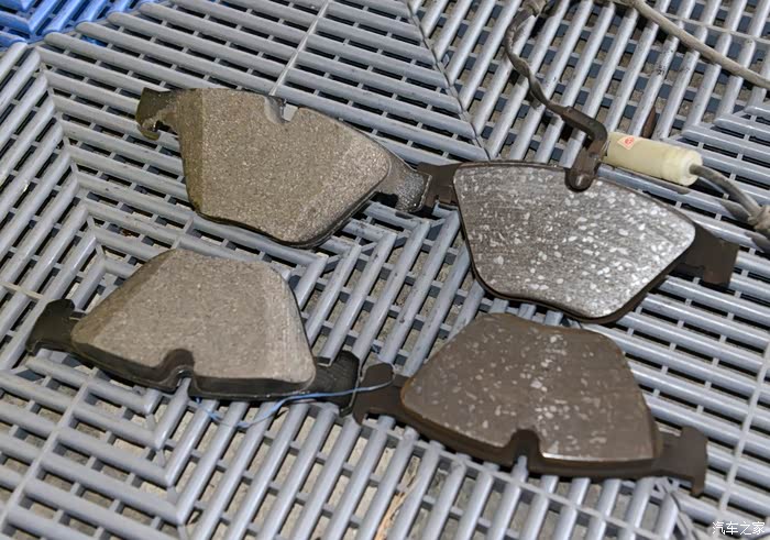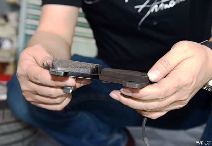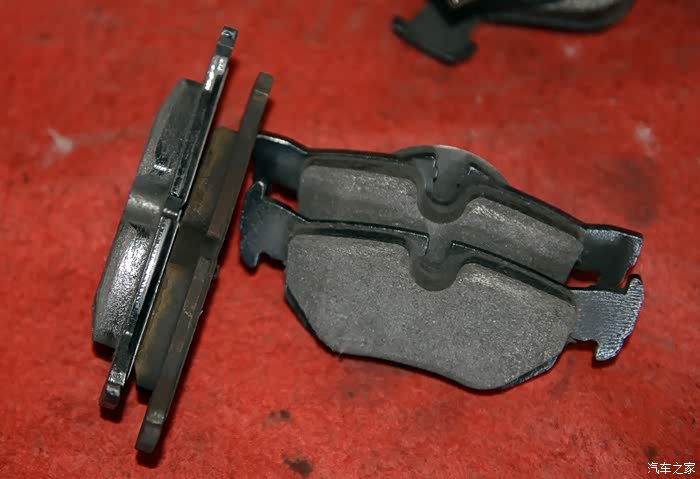 全新的刹车片和用过的刹车片,区别一目了然。(其实拆下来的刹车片再用上1-2万公里也是没问题的)