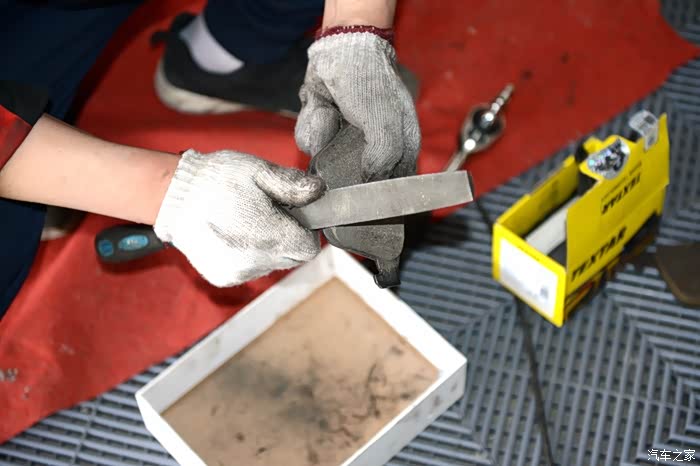 在安装刹车片之前,需要用锉磨一磨新刹车片,这样可以避免安装以后出现异响。