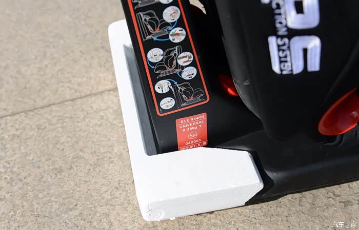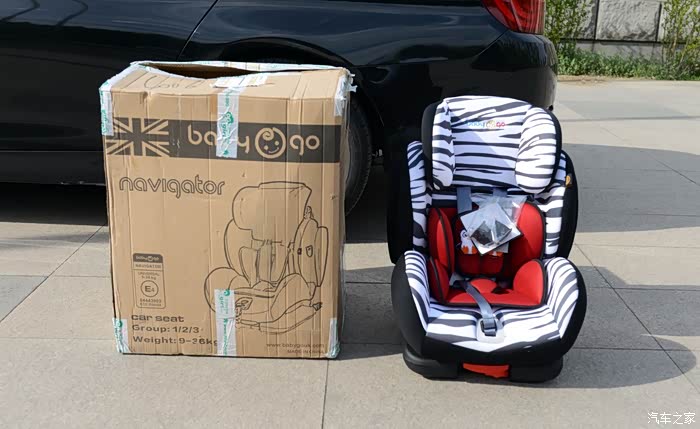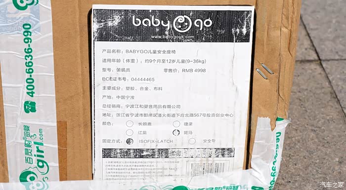 箱子上的贴的标签表述了几点信息:1、产品名称,2、适用年龄9个月-12岁(9-36kg),3:型号:领航员,4:零售价4999(忽略吧,其实才2000多),5、ECE证书编号,6、主要成分:塑胶、合金、布料,7、产地:中国宁波,8、颜色:斑马配色,9:、固定方式:ISOFIX、LATCH(上次体验的那个国产的是安全带的形式)