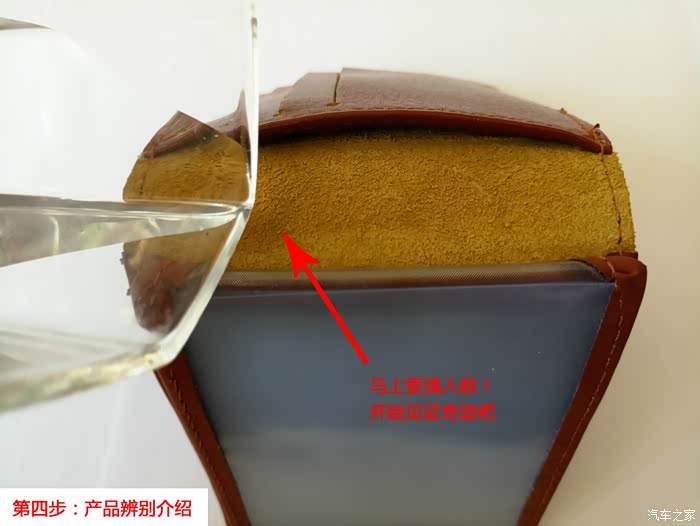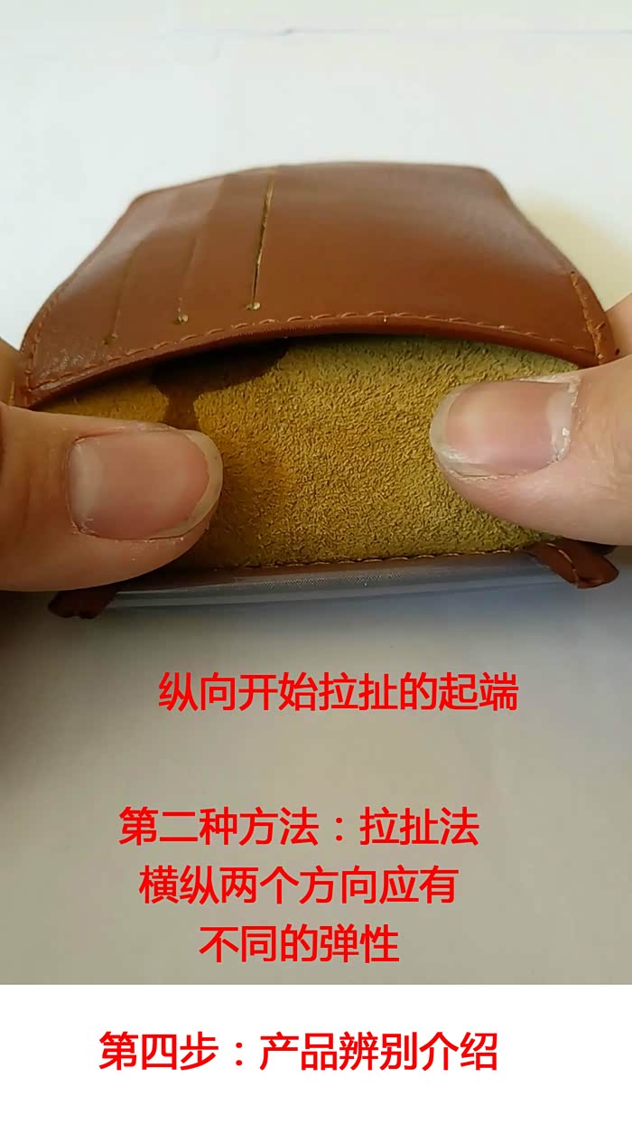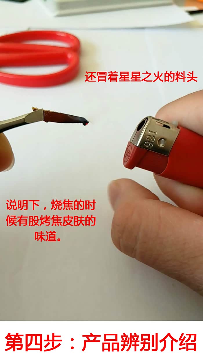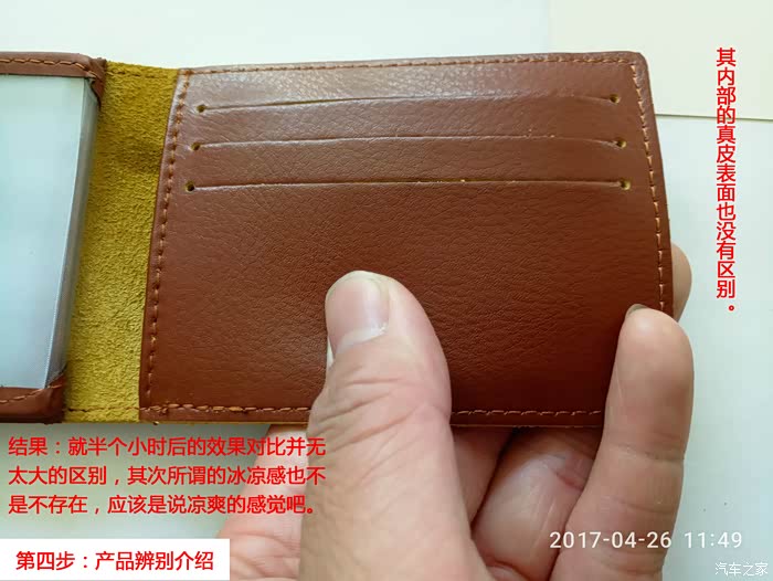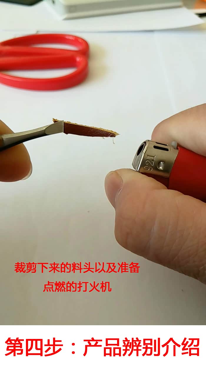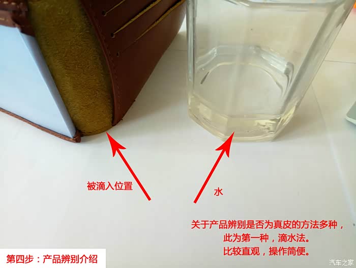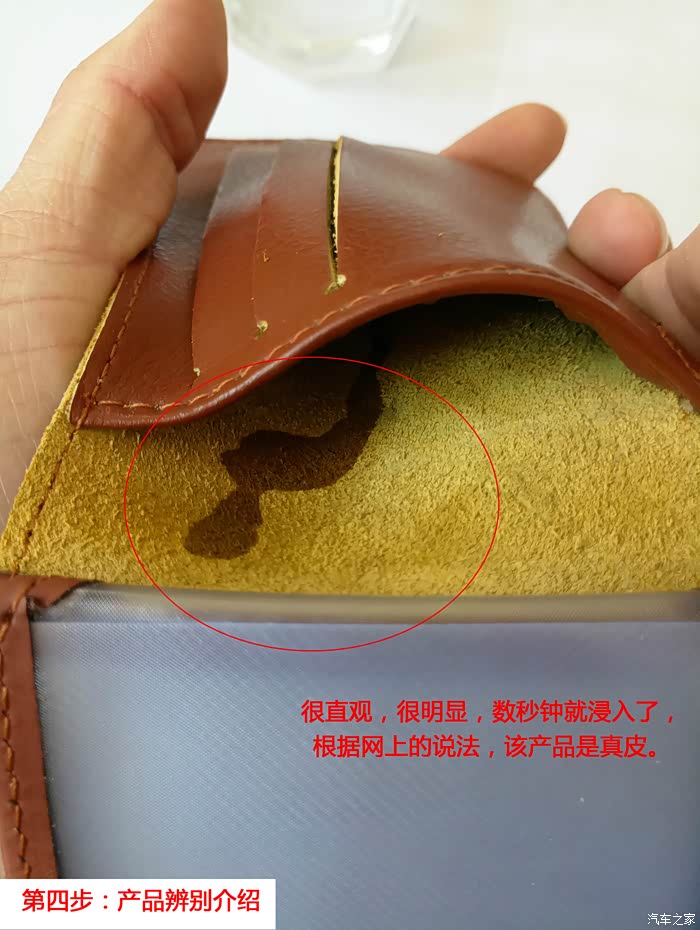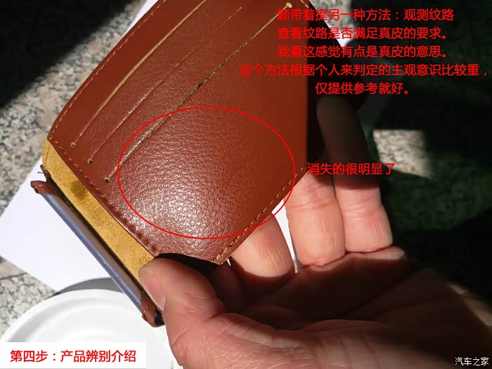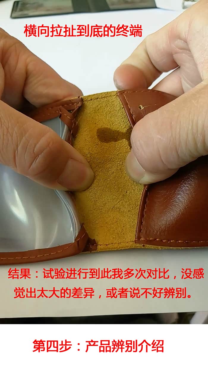 最后一个步骤,第四步则是产品辨别介绍。此次步骤结合了网络上流传的多种辨别真皮的方法----滴水法、拉扯法、划痕法、纹路观测、低温评测、烧料头,从多个方面验证此款产品为真皮,就结果而言,并非全部清晰明了,但是也是基本上也是满足基本的要求了。由于烧料头以及拉扯法中需要使用到双手,于是乎采用录像的方法进行记录,图片基本来自于录像之中,像素略有差异,望大家见谅。