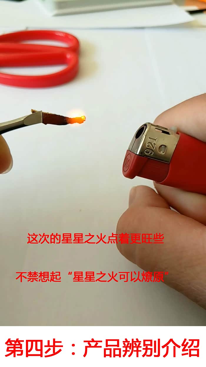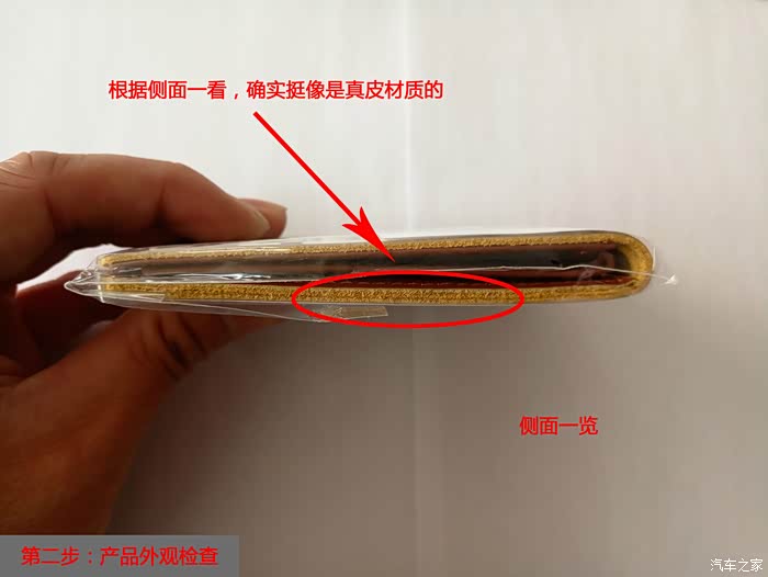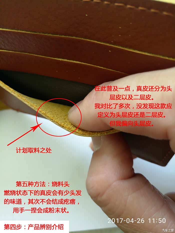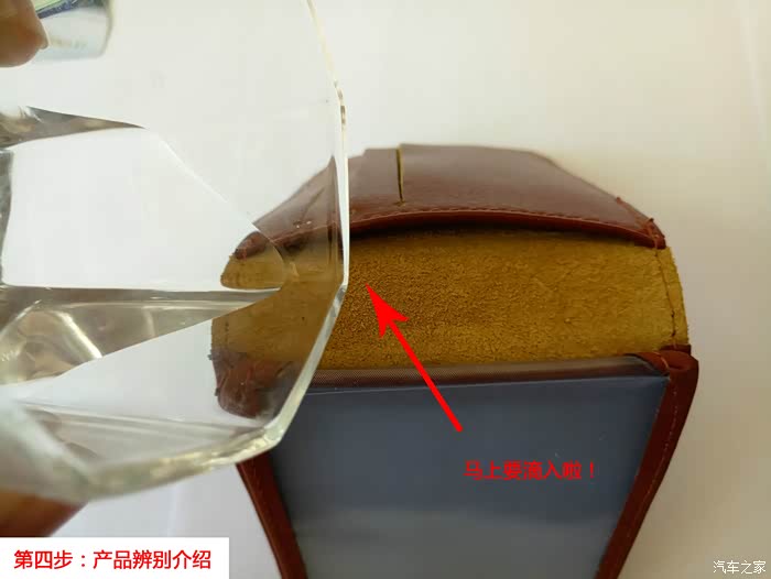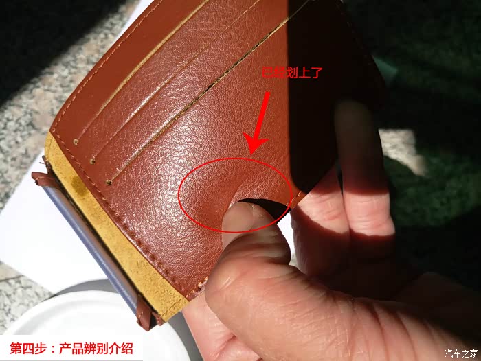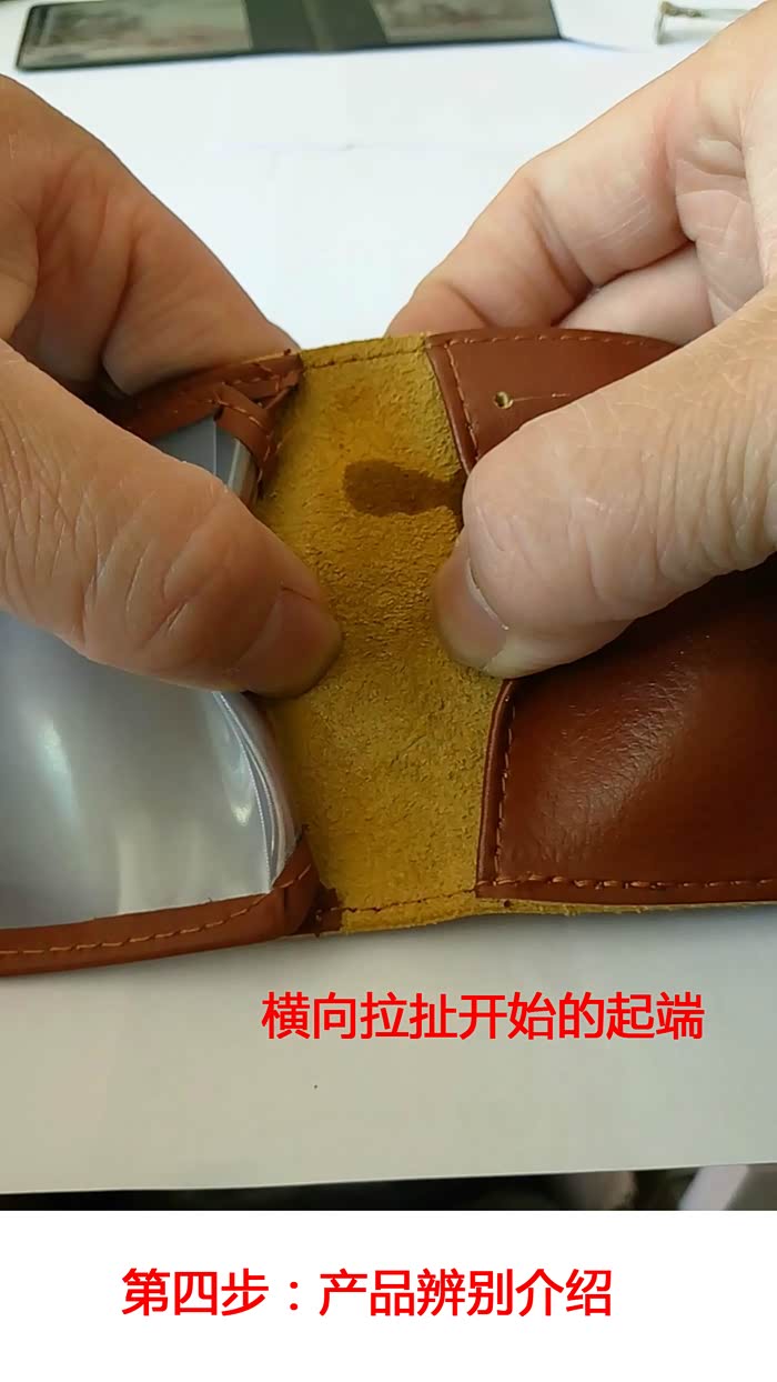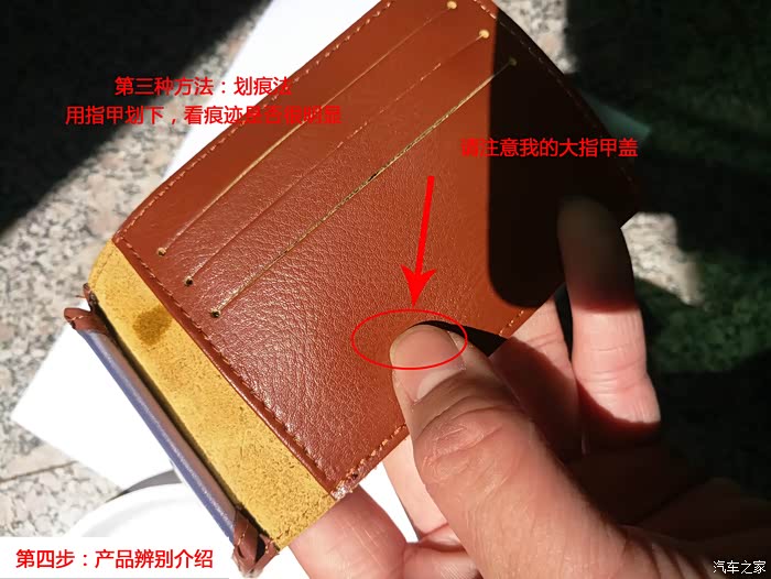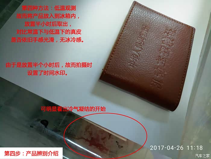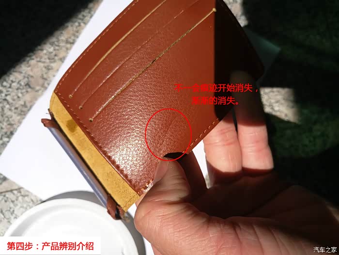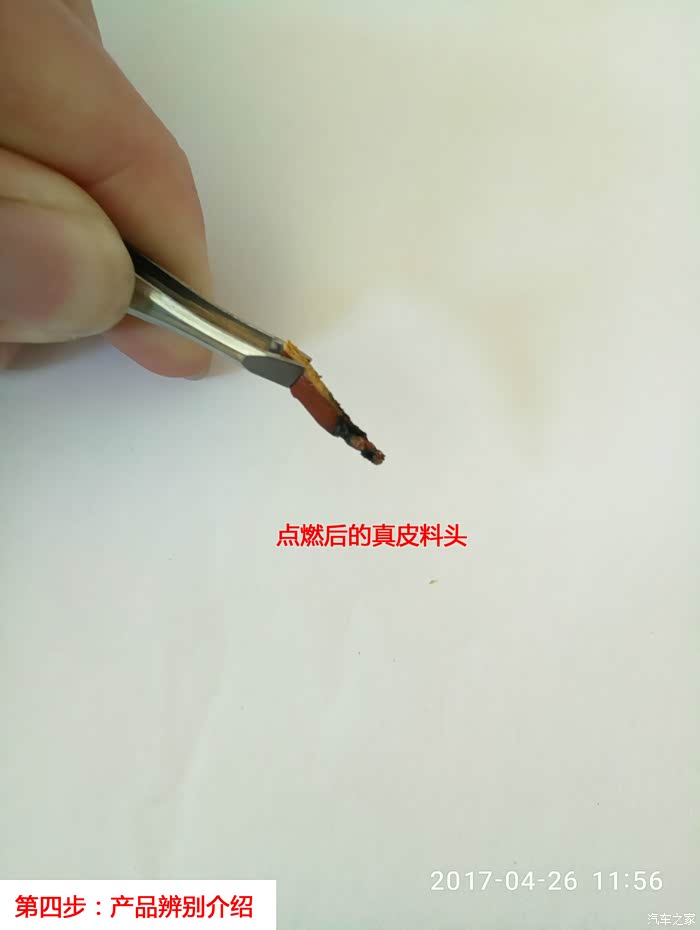 最后一个步骤,第四步则是产品辨别介绍。此次步骤结合了网络上流传的多种辨别真皮的方法----滴水法、拉扯法、划痕法、纹路观测、低温评测、烧料头,从多个方面验证此款产品为真皮,就结果而言,并非全部清晰明了,但是也是基本上也是满足基本的要求了。由于烧料头以及拉扯法中需要使用到双手,于是乎采用录像的方法进行记录,图片基本来自于录像之中,像素略有差异,望大家见谅。