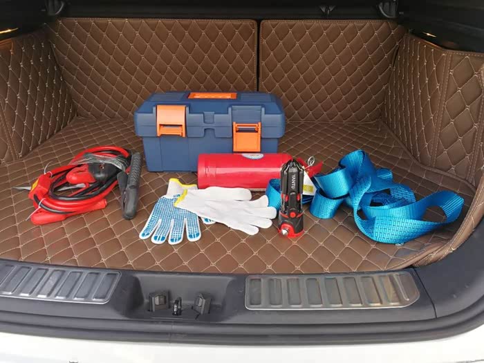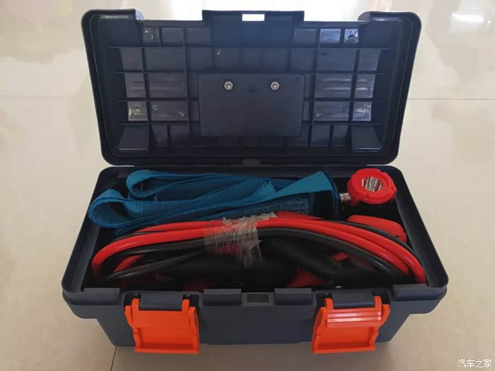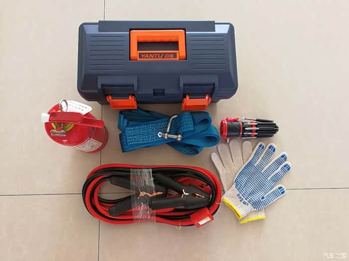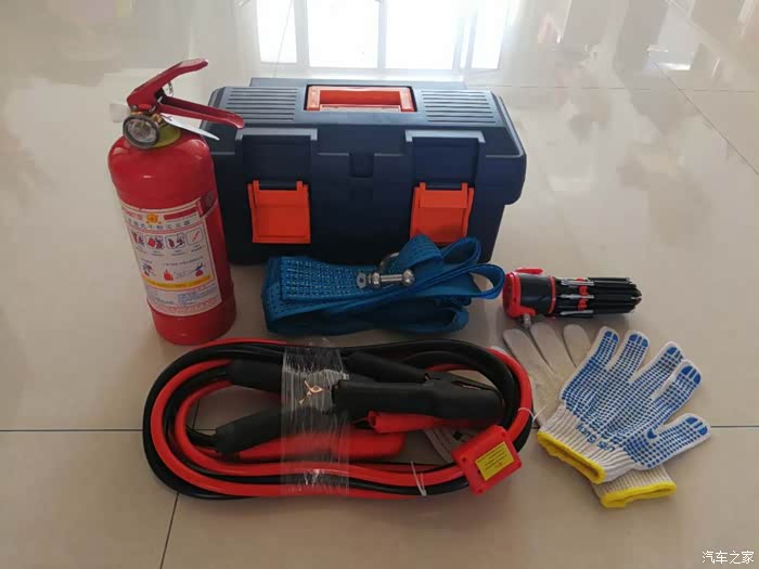 这个六件套:灭火器,应急安全锤,汽车电瓶搭火线,汽车拖车绳,绝缘手套,和一个可以容纳前五件东西的工具箱。整齐便捷方便携带。价格也很合理。