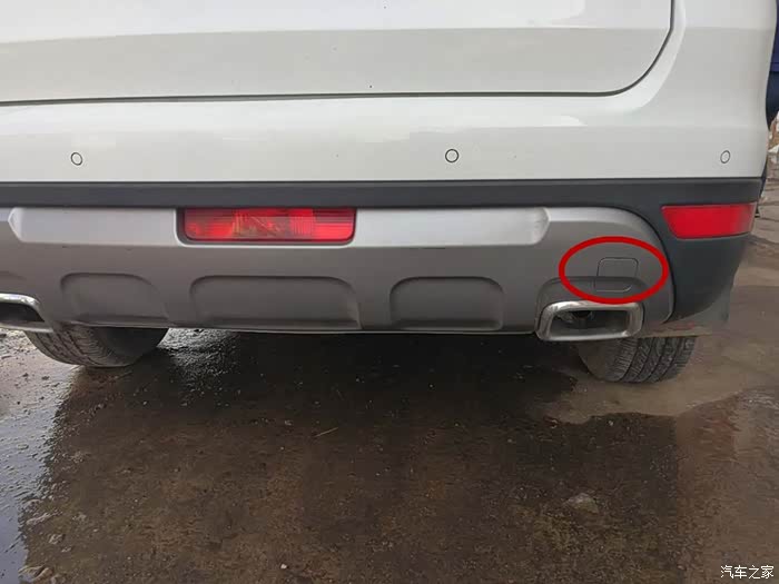这是博越车后面的拖车挂钩位置,在后面排气筒的上面,一个方块,打开后就可以安装挂钩了