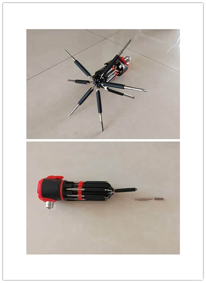 12合1多功能应急安全锤:八种螺丝刀批头,一个锤头割刀,一个锤尖,一个手电筒(带两个不同位置的灯),经过我的努力终于让我找到了这12种功能。