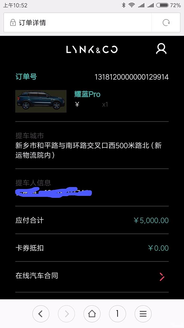 1.看车之前一直有买车的愿望,一个是因为家里原有的车子太小了,满足不了用车需求、再一个就是我们家的00后和10后对买车的要求(每次出去玩10后都说咱家的车太小了,没有天窗、后面不能睡觉,再买个车吧),开始看车吧!考虑到大多用处是出去玩轿车不看,日系车不买,便宜的70后还相不中,纠结,直到领克01上市,网上图片看着是真漂亮,没有见实车心里也没有底,现在还记得第一次去新乡看车的情景,车还没有停好阳光帅气的销售顾问已经从大厅里走出了迎接我们(后来才知道帅哥和我是老乡)。走进展厅第一眼就看到了喜欢的耀蓝Pro,全景天窗、后排可以放平空间还大(之前看过vv5它是天幕,直接不考虑)满足了两个孩子的要求,外观、内饰、颜色都是老婆喜欢的。车相中了销售说价格没有出来,可以预定,算了等价格出来再说吧。2订车十一月底价格出来了,销售顾问打电话过来说订车,这样的话年前可以提车,当时的心情有点复杂,是提第一批车还是再等等,是年前提还是过了年提,终于在2017.12月份下了订单。3提车等待提车的日子心情反倒平静了,车已经定了什么时候提无所谓,等吧!记得元月20号左右销售打电话过来,让我准备这几天提车,年前最后一批车到店,有我要的耀蓝Pro,2018.1月底终于把车开走了。(能在年前提到车,要感谢我的销售顾问刘晋阳,感谢他的5星服务。)4用车车子现在跑了4000+了基本上都是我一个人在开,个人感觉总体不错,科技感超强,主动刹车有点不习惯,大屏不错(能在上面看电影就更好了,目前这个我还不会弄)、电子档杆是我喜欢的,手感爽。重点说一下油耗,我是工地、山区、市区、县城、省道、高速都跑,综合油耗7.4。起步快,高速上再也不跟大车了,一脚油门超了,油耗的多少还是和个人的开车习惯有关的。2.0T的发动机、1.6吨的自重,预期想的是10个油以内我是可以接受,现在看来比我想的要好的多的多。希望后期还有惊喜!