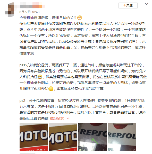 日前,微博上有网友发帖称,在京东全球购上买到了假的机油,起因是发现从京东上购买的机油和自己先前在正规实体店购买的机油包装差距较大。认为自己从京东上买到了假机油。