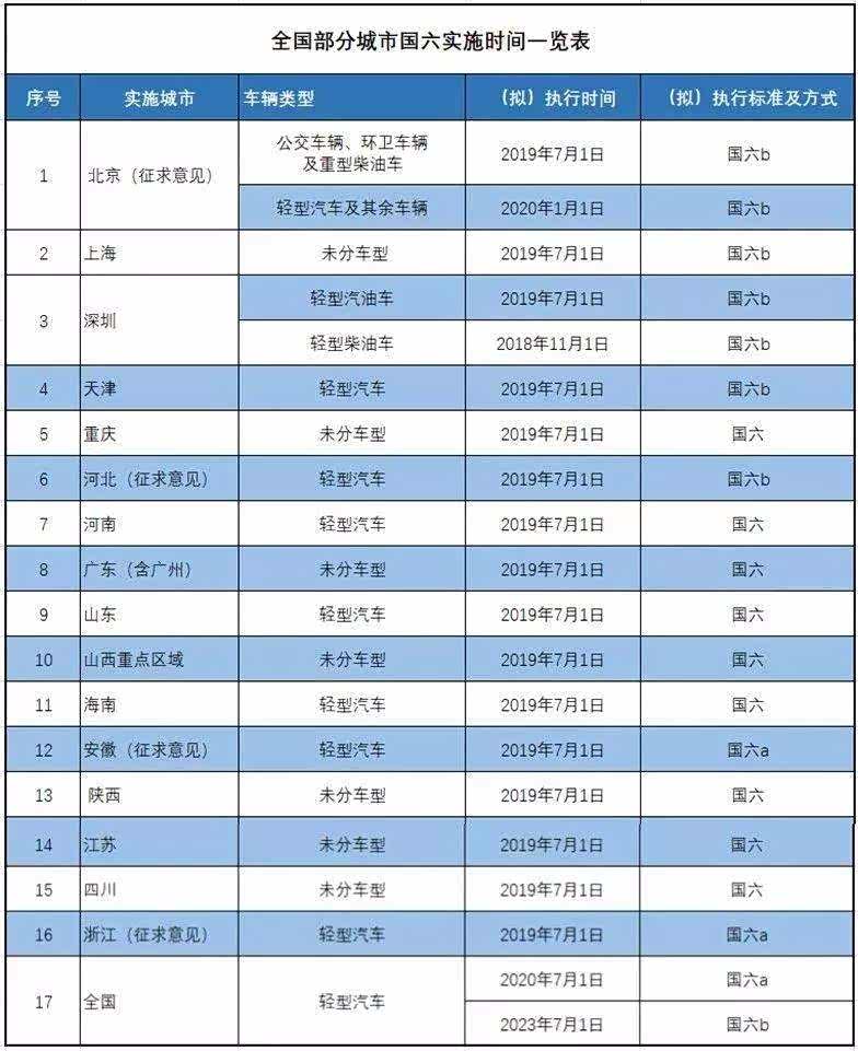 国六标准将分为两期执行,一个是国六A一个是国六B。对于2019年7月1日开始的是部分重点城市执行国六A标准,全国执行国六A将在2020年7月1日。而国六B则将在2023年7月1日在全国实施。也就是说,如果你不是在上述列表城市中,依然执行国五标准。