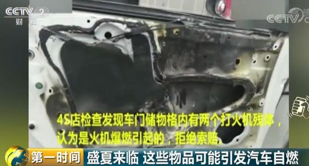 事后经检查发现,车门储物格内有两个打火机残体,初步断定是在太阳的暴晒下,车内温度升高引起打火机爆炸,从而导致汽车自燃。