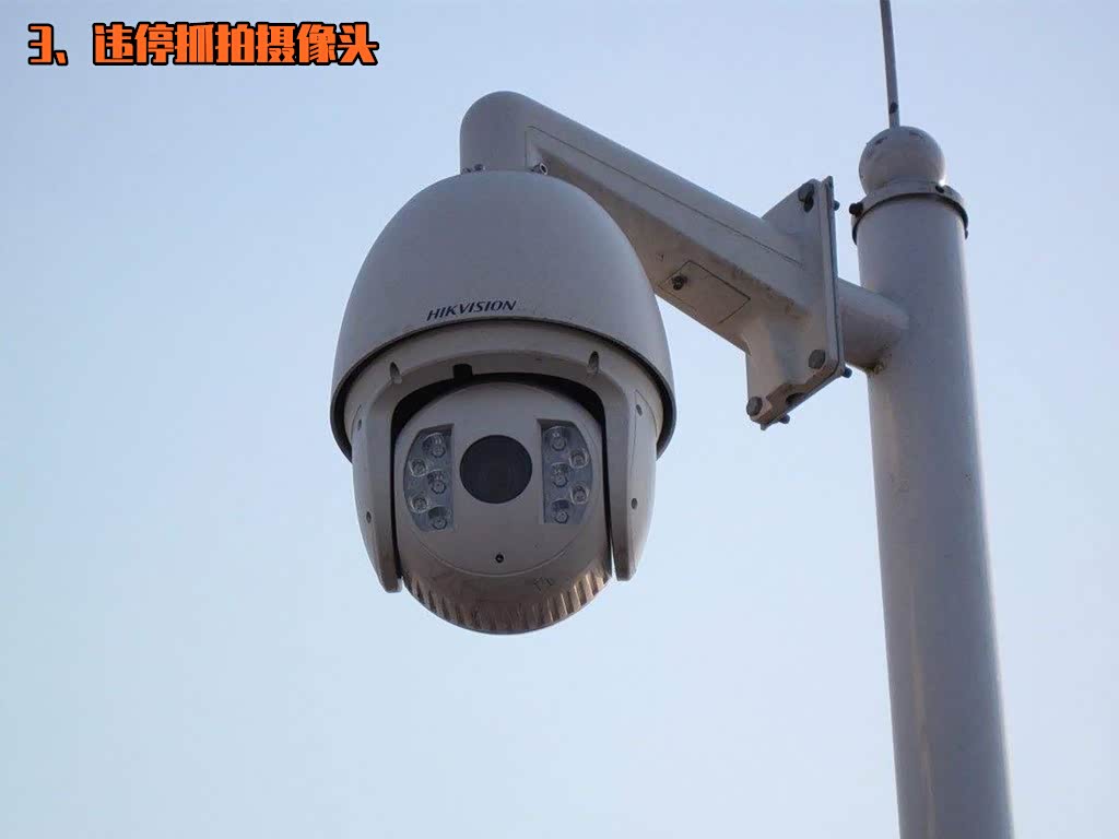 在一些严谨路边停车的路段,我们可以看到在十字路口附近安装有这种位置较高并带有转动功能的摄像头。它的优点就是可视面积大、焦距长,可以360度无死角拍摄管辖区域违停车辆信息。