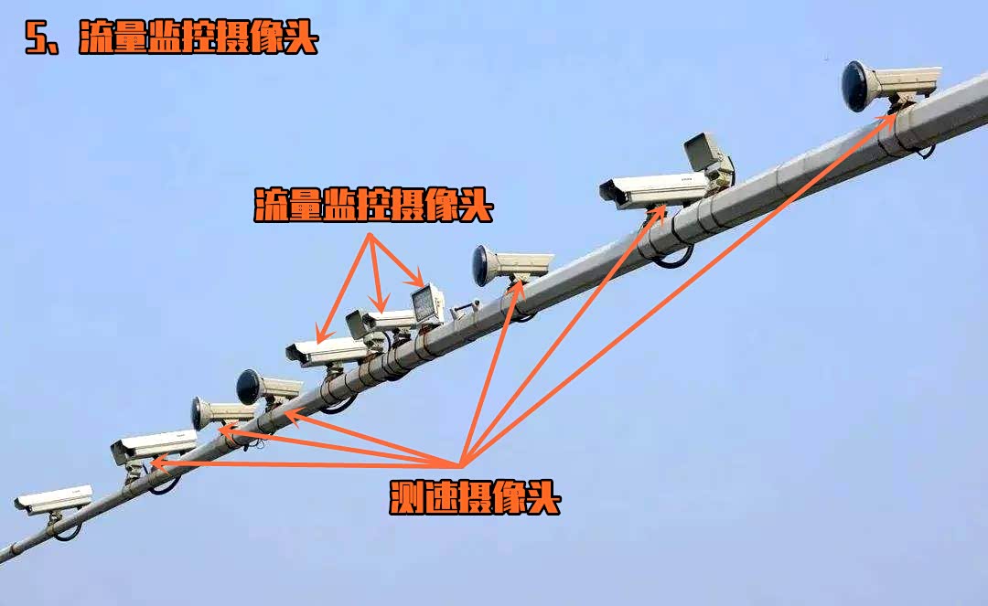 一般在城市的出口路段,会有这种流量监控摄像头。它的体积较小,但比较明显的是旁边会配备有一个闪光灯,在车辆驶过的瞬间,闪光灯暴闪一下,记录一个流量。但在它的旁边,往往会设计有多个测速摄像头。所以我们不要认为是流量监控摄像头就随意超速。