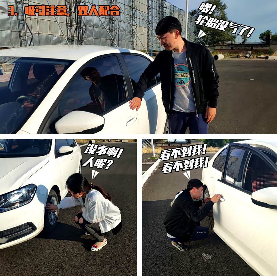 这种作案方式比较隐秘,不易被车主第一时间发觉。一般由两-三人配合。一人上前分散车主注意力。在车主精力分散时,另一人开始作案。一般,这种案情会发生在一些无监控或人流的地区。