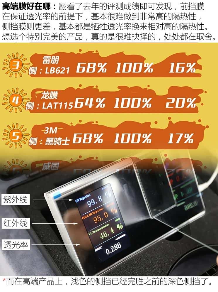 凤尾呢,大品牌首先虚标的情况要少,数据上还是相对不敢胡来的,但问题在于,大品牌≠全是高端产品,他有很多低端产品,表现远不如正经的国货,好在这种情况在后市场并不多见,主要还是在4S店环节,几乎你买车时附赠的大品牌膜,都是很入门的产品,加钱单独买的还好一些,但也不保证,毕竟人家实际贴的和你当初选的是不是一样都不好说,反正你看不出来。