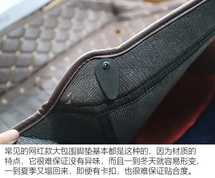从目前的脚垫发展来讲,纤维脚垫无疑是个趋势,也最环保,尤其是一体压制的大包围纤维脚垫,因为完全不用胶水,不仅不会变形,你看你的大包围脚垫还需要卡扣,即便如此天一冷它就变形,而纤维的完全不需要,都不会变形,这相比市场中火热的拼接皮的大包围要环保不知道多少条街了,但为什么还有那么多人买拼接皮的大包围?因为便宜!拼接的大包围脚垫也就200-300块钱,一体压制纤维大包围脚垫动辄就上千,你说值不值?每个人的答案都不同。