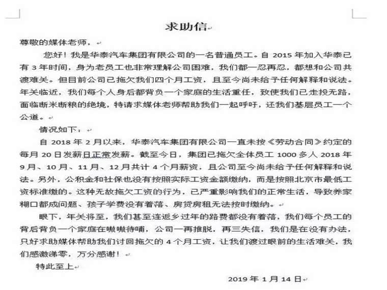 据了解,1月14日,华泰员工一封求助信将华泰汽车欠薪事件曝光至公众视野。华泰员工在信中表示,自2018年2月以来就从未按时发放工资,并至少欠薪4个月。