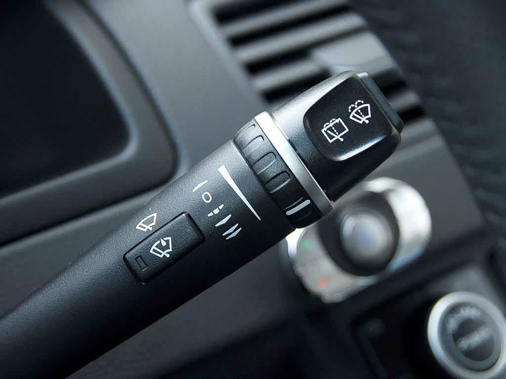 在汽车组合开关手柄上有雨刮器控制旋扭,设有多个档位。手柄顶端是洗涤器按键开关,按下开关有洗涤水喷出,配合雨刮器洗涤挡风玻璃。