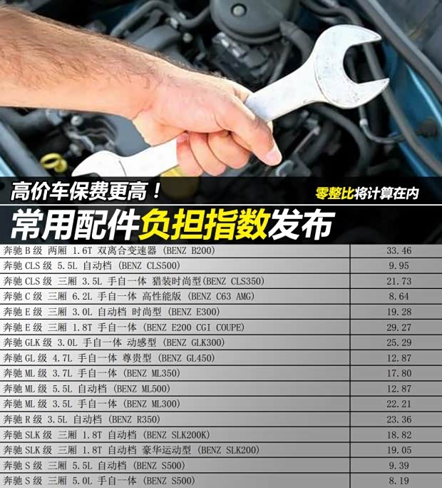 何为常用配件负担指数?零整比又是什么意思?这个指数究竟和我们广大消费者有何关系?相信很多人都有这样的疑问,本次公布的500款车型中,配件负担平均指数为13.79,低于均值的有301款车,占比59.6%;高于均值的有199款车,占比40.4%。消费者常用配件更换成本负担的差异较大,最大差异达8.2倍。简而言之,该数值越高,你在更换配件时所承担的费用就越高,以奔驰A级为例,它的负担指数达到了30以上,一台车的零配件拆散了卖,竟然可以买回来十多台整车……