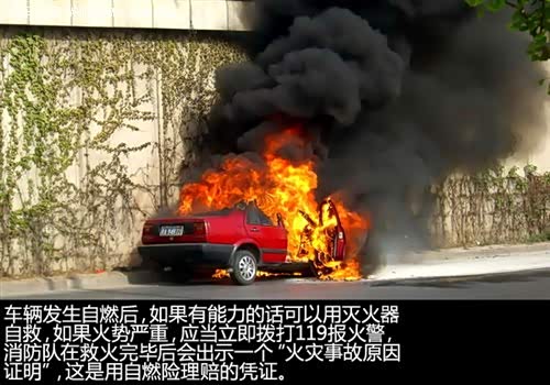 遇到自燃情况,如果火势比较小且能找到着火点的话,可以尝试使用灭火器进行自救,如果火势严重,应该立刻撤离车辆并且拨打119火警,待消防部门到现场将火情处理。处理完毕后,消防部门会出具一个火灾事故原因证明,这点很关键,如果车子属自燃险理赔范围并且投保了自燃险,就可以向保险公司索赔了。