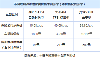 首先涉水险是车损险的附加险,如果没有购买车损险是不能单独购买涉水险的,车价越高,相应的保费也越贵。在拥有车损险的前提下,涉水险的保费是车损险的5%。如果按照一辆售价15万元的家用车为例,这辆车的涉水险大概在100元左右。下面是从平安保险公司采集的不同级别车型的涉水险价格: