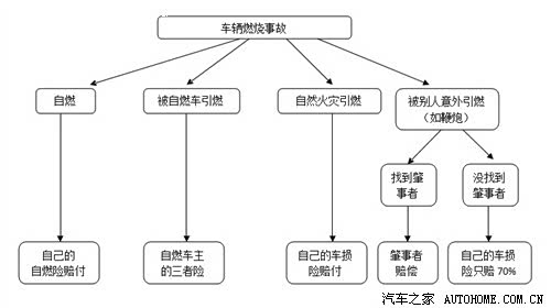 如果是被其他车辆引燃需要找通过对方的车损险进行赔付,如果是因为自燃火灾引起的燃烧,可通过自己的车损险进行赔付;还有一种常见现象就是过年时被鞭炮引燃,这种情况就只能想办法找到肇事者进行赔付,如果找不到肇事者的话,可以通过自己的车损险赔付,不过这种情况保险公司有权免赔30%,只能得到70%的赔付,即使你投保了不计免赔在这种情况下也不会得到全部赔偿,因为被鞭炮引燃属于特例。