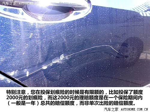 这里需要注意的是,划痕险是有承保额度的,一般是2000元、5000元、1万元和2万元。假如您买了2000元赔偿额的划痕险,在保险期限内,您通过划痕险可获得的理赔金额是1400元-1700元,因为划痕往往是找不到第三者的,因此根据相关规定有15%~30%的免赔额,但如果您还购买了对应划痕险的不计免赔险则可得到全额赔偿。