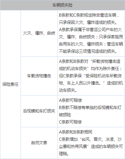 全国所有的保险公司履行的车险条款主要内容是统一的,且全部由保监会批准制定,但保监会根据参与制定车辆保险条例的中国三大车险保险公司:人保、平安和太平洋保险公司进行协商后将保险条款根据内容细节不同分为A条款(也称人保条款)、B条款(也称平安条款)、C条款(也称太平洋条款)三款,全国其他车辆保险公司根据自身的情况选择相应的保险条款使用。此外,在这三大条款之后,保监会批准天平保险公司采用自己制定的保险条款,它与A/B/C条款不一样,可以被称为D条款。我们下面先对常见的A/B/C这三种条款在相关保险项目上的区别给大家介绍,之后会对D条款再进行介绍。