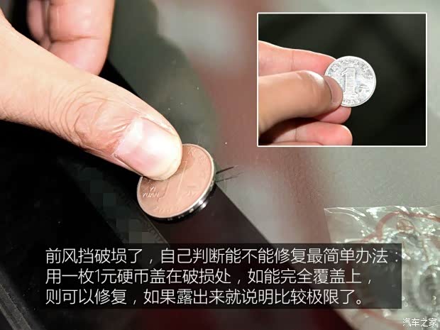 可修补修复不是万能的,伤口的大小也有限制,如果超过25mm的伤口就不太容易修复了,这里教您一个快速判断前风挡伤口是否能进行修复的方法:找一枚人民币1元硬币,如果可以将伤口完全覆盖上,那么9成就是可以修复的。