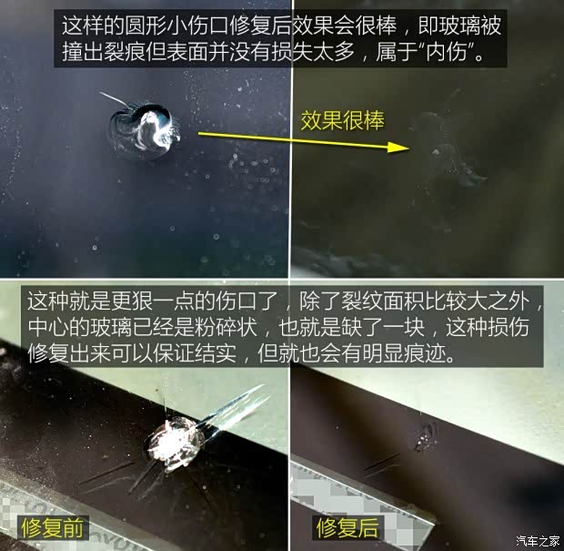之前也介绍过这种工艺的原理,很简单,就是将树脂注入到玻璃的裂痕中,然后用紫外线将树脂硬化达到修补作用,跟补牙极为相似。我们之前也做过此修复工艺的具体操作步骤介绍,大家可以在用车频道查看。
