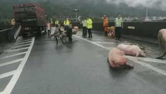 根据媒体消息,就在前天在肃宁高速丽水路段,一辆装载生猪的货车过弯道时没有提前减速,车辆发生侧翻,一车生猪甩到了路上。