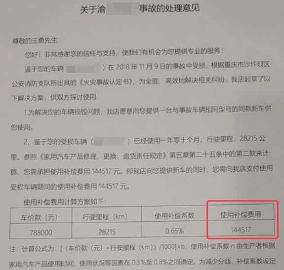 事故责任也很明显,车主就此事向4S店提出了赔偿,车主收到了奔驰4S店方面给出的处理方案:车主王先生支付14万多元的使用补偿费用,然后4S店赔付车主同款新车。