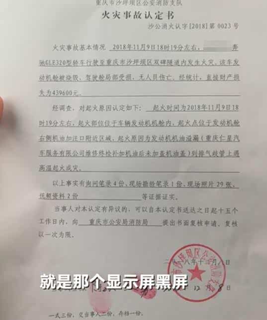 经过鉴定,这辆奔驰起火的具体原因是发动机机油溢漏到排气歧管上,高温引起的的火灾,由于4S店工作人员没有盖上机油盖,行驶的过程中高温的机油溢出了发动机,从而引起了火灾。