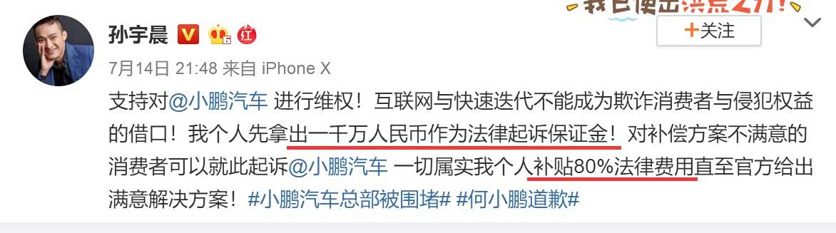 小鹏汽车老车主集体维权事件再升级。以300多万元拍下巴菲特慈善午宴的孙宇晨,在微博上声称支持小鹏车主进行维权,并以个人名义拿出一千万人民币作为法律起诉保证金,支持小鹏车主起诉小鹏汽车,补贴80%法律费用直至官方给出满意解决方案。
