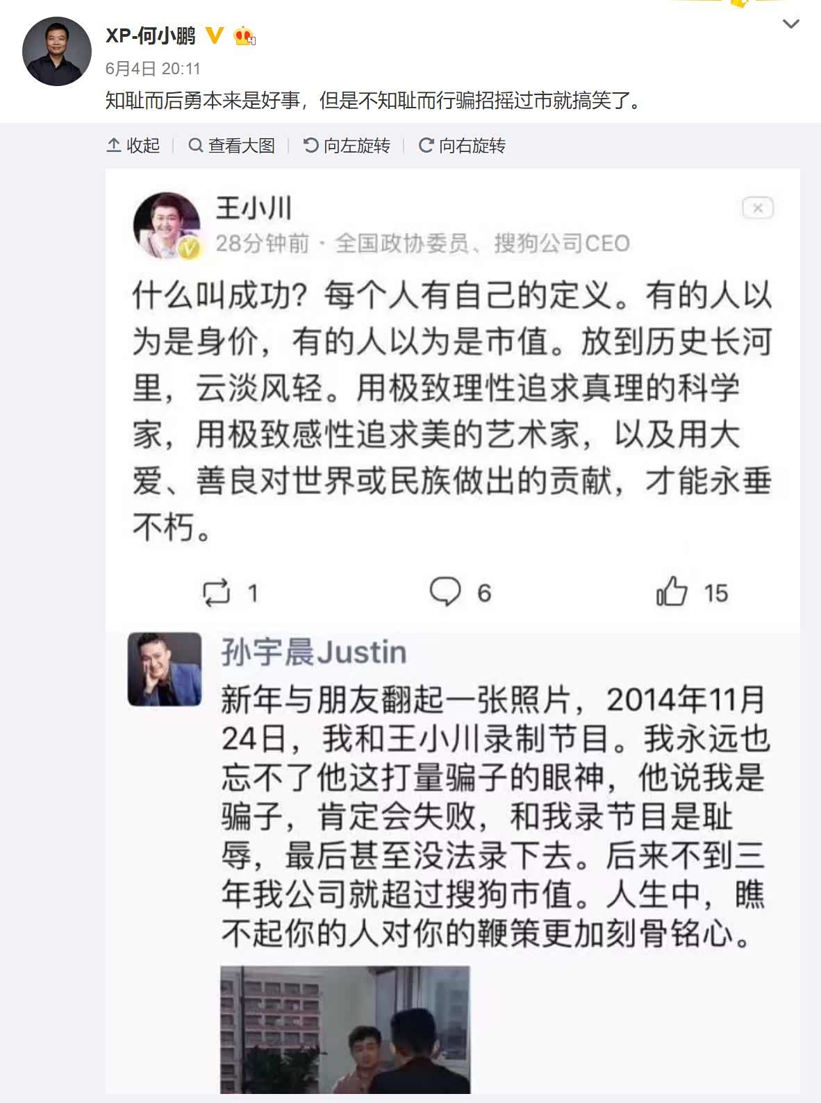 有网友透露,孙宇晨之所以支持车主维权,是因为他和小鹏汽车创始人、董事长兼CEO何小鹏曾有矛盾。在天价午宴宣布后,何小鹏曾在微博上指责孙宇晨,“知耻而后勇本来是好事,但是不知耻而行骗招摇过市就搞笑了。”